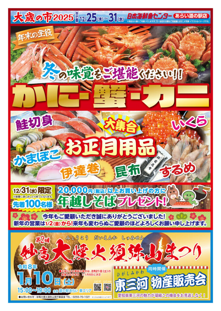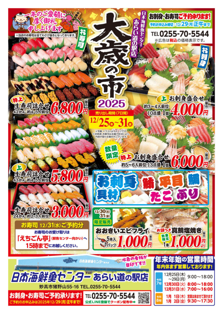 12/25(木)~12/31(水)の7日間、日本海鮮魚センターあらい道の駅店にて